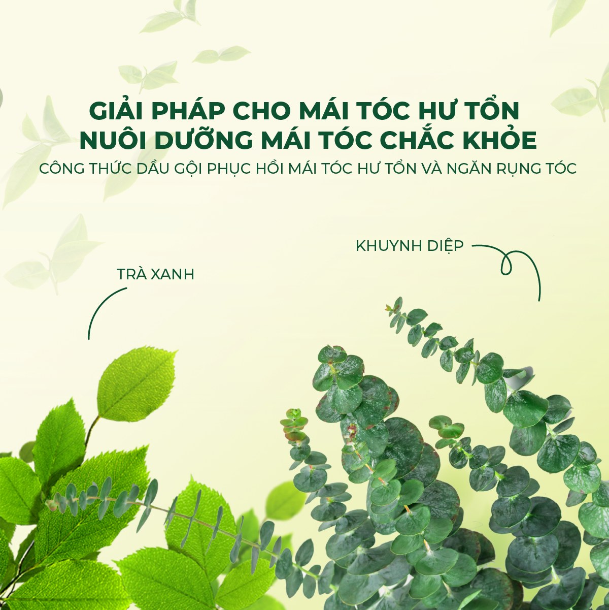 Trà xanh giàu EGCG có tác dụng chống oxy hóa mạnh mẽ, giúp ngăn ngừa lão hóa da đầu và giảm viêm, trong khi khuynh diệp có tính kháng khuẩn cao, giúp làm sạch da đầu, giảm gàu và giảm ngứa. Sản phẩm không chỉ nuôi dưỡng mái tóc mà còn mang lại cảm giác thư giãn với hương thơm dịu nhẹ từ khuynh diệp và trà xanh.